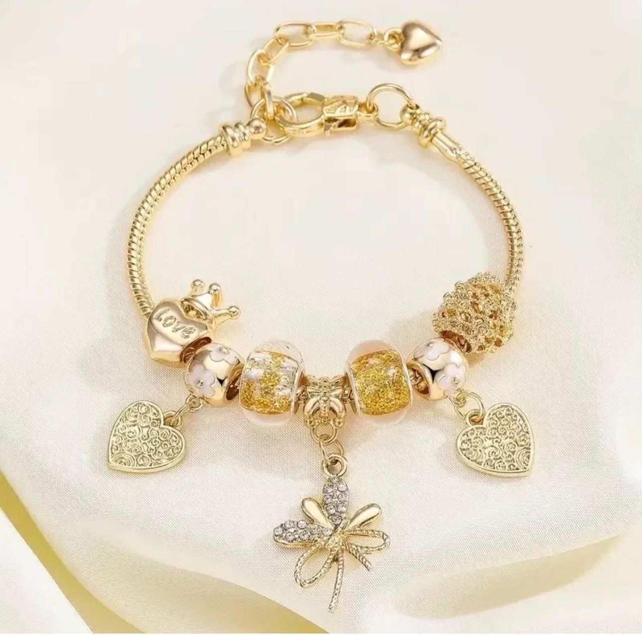 Gold Charm Sparkling Rhinestone Heart/Crystal Bow Bracelet